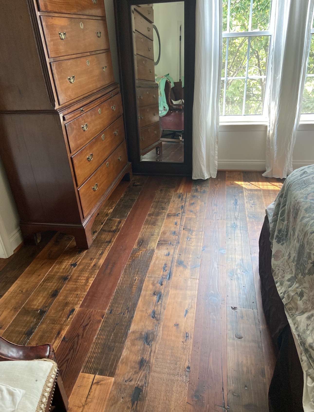 Opt for the popular original patina face for a flooring style that boasts a natural appearance. The patina, a result of the wood’s natural aging process when exposed to the elements, imparts a unique and rustic look to each individual piece. The real character of each board adds to the allure and aesthetic value of the original patina flooring, bringing a sense of elegant antiquity to any room.